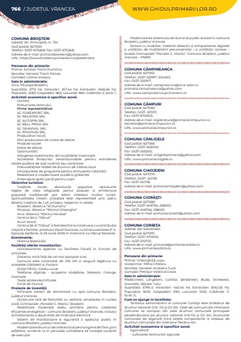 COMUNA BRO%u015eTENIAdres%u0103: Str. Principal%u0103, nr. 134Cod po%u0219tal: 627050Telefon: 0237-675268; Fax: 0237-675268; Adresa de e-mail: primariabrosteni@yahoo.comURL: https://www.brosteni.primarievn.ro/prezentarePersoane din primarie:Primar: Emilian Florin DumitriuSecretar General: Florin PoneaContabil: Liliana Iona%u015fcuSate %u00een administra%u021bie:Arva, Pitulu%u015fa Bro%u0219teniSuprafa%u021ba:%u00a0 2713 ha; Intravilan:%u00a0 257,44 ha; Extravilan:%u00a0 2455,56 ha; Popula%u021bia:%u00a02283; Gospod%u0103rii:%u00a0860; Locuin%u021be:%u00a0860; Gr%u0103dini%u021be:%u00a02; %u0218coli:%u00a01; Activitati economice si specifice zonei:Comer%u021bPrelucrarea lemnuluiFirme reprezentative:SC FOREXPORT SRLSC RELISTAN SRLSC AUTOPIN SRLSC BELL PROD SRLSC GEANIVAL SRLSC ROVOION SRLProduc%u0103tori locali:Mici producatori de miere de albineProduse locale:Miere de albineOportunit%u0103%u021bi:Atragerea investitorilor din localit%u0103%u021bile %u00eenvecinateAccesarea fondurilor nerambursabile pentru extinderea re%u021belei publice de ap%u0103%u00a0curent%u0103%u00a0sau canalizare%u00cembun%u0103t%u0103%u021birea re%u021belei de drumuri de interes localIntroducerea de programe pentru stimularea natalit%u0103%u021biiReabilitare %u0219i modernizare %u0219coal%u0103%u00a0%u0219i gr%u0103dini%u021beAmenajare spa%u021bii joac%u0103%u00a0pentru copiiObiective turistice:Tradi%u021biile locale, obiceiurile populare, obiceiurile legate de via%u021ba%u00a0 religioas%u0103, portul popular %u0219i arhitectura popular%u0103%u00a0 tradi%u021bional%u0103%u00a0 pot st%u00e2rni interesul multor turi%u0219ti. Spiritualitatea cre%u0219tin ortodox%u0103%u00a0 este reprezentat%u0103%u00a0 prin patru Biserici cre%u0219tine de cult ortodox, respectiv %u00een sateleBro%u0219teni- Biserica %u201cSf Dumitru%u201dPitulusa- Biserica %u201cSfantul Gheorghe%u201dArva- Biserica%u00a0%u201cSfantul Nicolae%u201dCentrul de zi %u201cD%u0103nu%u021b%u201dScurt istoric:Centrul de Zi %u201cD%u0103nu%u021b%u201d a fost deschis la ini%u021biativa %u0219i cu contribu%u021bia major%u0103%u00a0a familiei, preotului Dorel Norocea, cu binecuvantarea P. S. Episcop Epifanie, la 29 Iunie 2006 %u00een memoria lui D%u0103nu%u021b%u00a0NoroceaEvenimente:Hramul BisericilorFacilit%u00e3%u0163i oferite investitorilor:Concesionarea spa%u021biilor cu facilitate fiscal%u0103 %u00een func%u021bie de activitateDistan%u021ba mic%u0103%u00a0fa%u021b%u0103%u00a0de cel mai apropiat ora%u0219Comuna este traversat%u0103%u00a0 de DN 2M %u0219i asigur%u0103%u00a0 leg%u0103tura cu ora%u0219elele Odobe%u0219ti %u0219i Foc%u0219aniSta%u021bie PECO, mediu curatTelefonie digitala - acoperire Vodafone, Telekom, Orange, CosmoteToate satele electrificateFor%u021b%u0103%u00a0de munc%u0103Proiecte de investi%u0163ii:%u00cenfiin%u021bare sistem de alimentare cu ap%u0103%u00a0 comuna Bro%u0219teni, jude%u021bul VranceaConstruire sal%u0103%u00a0de festivit%u0103%u021bi cu vestiare, amplasata %u00een curtea %u0219colii Gimnaziale %u201ePanaite C. Mazilu%u201d Bro%u0219teniReabilitare moderat%u0103%u00a0 sediu prim%u0103rie pentru cre%u0219terea eficien%u021bei energetice %u2013 comuna Bro%u0219teni, jude%u021bul Vrancea, inclusiv achizi%u021bionarea a dou%u0103%u00a0sta%u021bii de %u00eenc%u0103rcare electric%u0103Sistem de monitorizare %u0219i siguran%u021b%u0103%u00a0 a spa%u021biului public %u00een comuna Bro%u0219teni, jude%u021bul VranceaModernizare drumuri de interes local pe o lungime de 7 km, prin asfaltare, urm%u00e2nd ca %u00een perioada urm%u0103toare s%u0103%u00a0%u00eenceap%u0103%u00a0lucr%u0103rile de execu%u021bieModernizarea sistemului de iluminat public stradal %u00een comuna Bro%u0219teni, jude%u021bul VranceaDotare cu mobilier, material didactic %u0219i echipamente digitale a unit%u0103%u021bilor de %u00eenv%u0103%u021b%u0103m%u00e2nt preuniversitar i a unit%u0103%u021bilor conexe %u2013 %u0218coala Gimnazial%u0103 %u201cPanaite C. Mazilu%u201d Comuna Bro%u0219teni, jude%u021bul Vrancea %u2013 PNRR.COMUNA C%u00c2MPINEANCACod po%u0219tal: 627055Telefon: 0237-222917, 224463; Fax: 0237-222917; Adresa de e-mail: campineanca@vn.e-adm.roprimaria.campineanca@yahoo.comURL: www.campineanca.primarievn.roCOMUNA C%u00c2MPURICod po%u0219tal: 627060Telefon: 0237- 670111; Fax: 0237-670003; Adresa de e-mail: registratura@primariacimpurivn.rosecretar@primariacimpurivn.roURL: www.primariacimpurivn.roCOMUNA C%u00c2RLIGELECod po%u0219tal: 627065Telefon: 0237-253000; Fax: 0237-253200; Adresa de e-mail: cirligeleprimaria@yahoo.comURL: www.primariacirligele.roCOMUNA CHIOJDENICod po%u0219tal: 627070Telefon: 0237- 241118; Fax: 0237-241118; Adresa de e-mail: primariachiojdeni@yahoo.comCOMUNA CIOR%u0102%u015eTICod po%u0219tal: 627080Telefon: 0237-249756, 258001; Fax: 0237-249756, 258001; Adresa de e-mail: primariaciorasti@yahoo.comCOMUNA CORBI%u0162AAdres%u0103: Sat %u0218erb%u0103ne%u0219tiCod po%u0219tal: 627097Telefon: 0237-270505; Fax: 0237-270731; Adresa de e-mail: primarie@primariacorbita.roURL: www.primariacorbita.roPersoane din primarie:Primar: Gheorghi%u021b%u0103 LupuViceprimar: Mihai ChelaruSecretar General: Ani%u0219oara %u021auc%u0103Contabil:%u00a0Petri%u015for-Valeric%u0103%u00a0Groza%u00a0Sate %u00een administra%u021bie:R%u0103d%u0103cine%u0219ti, L%u0103rg%u0103%u0219eni, Corbi%u021ba, %u015eerb%u0103ne%u015fti, Buda, Oche%u0219e%u0219ti, Izvoarele, V%u00e2lcele,%u00a0%u021au%u021buSuprafa%u021ba:%u00a0 5795 a; Intravilan:%u00a0 452,45 ha; Extravilan:%u00a0 5342,55 ha; Popula%u021bia:%u00a0 1600; Gospod%u0103rii:%u00a0 990; Locuin%u021be:%u00a0 1025; Gr%u0103dini%u021be:%u00a0 3; %u0218coli:%u00a03; Cum se ajunge in localitate:Teritoriul administrativ al comunei Corbi%u0163a este str%u0103b%u0103tut de drumul na%u021bional D.N. 11A %u015fi DJ 241. C%u0103ile de comunica%u021bii interioare comunei se compun din %u0219ase drumuri comunale principale perpendiculare pe drumul na%u021bional D.N.11A %u015fi DJ 241, drumurile comunale de legatur%u0103%u00a0 %u00