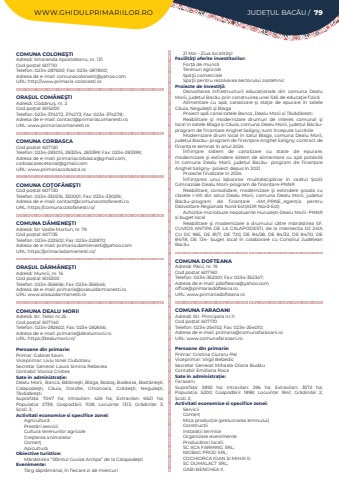 WWW.GHIDULPRIMARIILOR.RO JUDE%u021aUL BAC%u0102U / 79COMUNA COLONE%u015eTIAdres%u0103: Smaranda Apostoleanu, nr. 131Cod po%u0219tal: 607110Telefon: 0234-287600; Fax: 0234-287800; Adresa de e-mail: comunacolonesti@yahoo.comURL: http://www.primaria-colonesti.roORA%u0218UL COM%u0102NE%u015eTIAdres%u0103: Ciob%u0103nu%u015f, nr. 2Cod po%u0219tal: 605200Telefon: 0234-374272, 374273; Fax: 0234-374278; Adresa de e-mail: contact@primariacomanesti.roURL: www.primariacomanesti.roCOMUNA CORBASCACod po%u0219tal: 607120Telefon: 0234-283015, 283254, 283399; Fax: 0234-283399; Adresa de e-mail: primariacorbasca@gmail.com,corbascasecetariat@gmail.comURL: www.primariacorbasca.roCOMUNA CO%u0162OF%u0102NE%u015eTICod po%u0219tal: 607130Telefon: 0234-330216, 330001; Fax: 0234-330216; Adresa de e-mail: contact@comunacotofanesti.roURL: https://comunacotofanesti.ro/COMUNA D%u0102MIENE%u015eTIAdres%u0103: Str Vasile Mortun, nr 79Cod po%u0219tal: 607135Telefon: 0234-222502; Fax: 0234-222870; Adresa de e-mail: primaria.damienesti@yahoo.comURL: https://primariadamienesti.ro/ORA%u0218UL D%u0102RM%u0102NE%u015eTIAdres%u0103: Muncii, nr. 16Cod po%u0219tal: 605300Telefon: 0234-356656; Fax: 0234-356546; Adresa de e-mail: primaria@orasuldarmanesti.roURL: www.orasuldarmanesti.roCOMUNA DEALU MORIIAdres%u0103: str. Teilor nr.25Cod po%u0219tal: 607140Telefon: 0234-282602; Fax: 0234-282656; Adresa de e-mail: primarie@dealumorii.roURL: https://dealumorii.ro/Persoane din primarie:Primar: Gabriel%u00a0Savin%u00a0Viceprimar: Liviu Ionel CiubotaruSecretar General: Laura Simina RebeceaContabil:%u00a0Viorica%u00a0CristeaSate %u00een administra%u021bie:Dealu Morii,%u00a0 Banca, B%u0103l%u0103ne%u015fti, Blaga, Bobo%u015f, Bodeasa, Bost%u0103ne%u015fti, Calapode%u015fti, C%u0103uia, Dorofei, Ghionoaia, Gr%u0103de%u015fti, Negule%u015fti, T%u0103v%u0103d%u0103re%u015ftiSuprafa%u021ba:%u00a0 7047 ha; Intravilan:%u00a0 426 ha; Extravilan:%u00a0 6621 ha; Popula%u021bia:%u00a0 2739; Gospod%u0103rii:%u00a0 1108; Locuin%u021be:%u00a0 1313; Gr%u0103dini%u021be:%u00a0 3; %u0218coli:%u00a03; Activitati economice si specifice zonei:Agricultur%u0103Prest%u0103ri serviciiCultura terenurilor agricoleCre%u015fterea animalelorComer%u0163Apicultur%u0103Obiective turistice:M%u0103n%u0103stirea %u201cSf%u00e2ntul Cuvios Antipa%u201d de la Calapode%u015ftiEvenimente:T%u00e2rg s%u0103pt%u0103m%u00e2nal, %u00een fiecare zi de miercuri 21 Mai - Ziua localit%u0103%u0163iiFacilit%u00e3%u0163i oferite investitorilor:For%u0163%u0103 de munc%u0103Terenuri agricoleSpa%u0163ii comercialeSpa%u0163ii pentru rezolvarea sectorului zootehnicProiecte de investi%u0163ii:Dezvoltarea infrastructurii educa%u021bionale din comuna Dealu Morii, jude%u021bul Bac%u0103u prin construirea unei S%u0103li de educa%u0163ie fizic%u0103Alimentare cu ap%u0103, canalizare %u015fi sta%u0163ie de epurare %u00een satele C%u0103uia, Negule%u015fti %u015fi BlagaProiect ap%u0103 canal satele Banca, Dealu Morii %u0219i T%u0103v%u0103d%u0103re%u0219tiReabilitare %u015fi modernizare drumuri de interes comunal %u015fi local %u00een satele Blaga %u0219i C%u0103uia, comuna Dealu Morii, jude%u021bul Bac%u0103uprogram de finan%u021bare Anghel Saligny; sunt %u00eencepute lucr%u0103rileModernizare drum local %u00een satul Blaga, comuna Dealu Morii, jude%u021bul Bac%u0103u- program de finan%u0163are Anghel Saligny; contract de finan%u021bare semnat %u00een anul 2024%u00cenfiin%u0163are sistem de canalizare cu sta%u021bie de epurare, modernizare %u015fi extindere sistem de alimentare cu ap%u0103 potabil%u0103 %u00een comuna Dealu Morii, jude%u021bul Bac%u0103u- program de finan%u021bare Anghel Saligny- proiect depus %u00een 2021Proiecte finalizate %u00een 2024%u00cenfiin%u0163area unui laborator multidisciplinar %u00een cadrul %u015ecolii Gimnaziale Dealu Morii-program de finan%u021bare-PNNRReabilitare, consolidare, modernizare %u015fi extindere %u015fcoala cu clasele I-VIII din satul Dealu Morii, comuna Dealu Morii, judetul Bac%u0103u-program de finan%u021bare -AM_PRNE_Agen%u021bia pentru Dezvoltare Regionala Nord-Est(ADR Nord-Est)Achizi%u021bie microbuze nepoluante Huruie%u0219ti-Dealu Morii-%u00a0PNNR %u0219i buget localReabilitare %u015fi modernizare a drumului c%u0103tre m%u0103n%u0103stirea SF. CUVIOS ANTIPA DE LA CALAPODESTI, de la intersec%u021bia DJ 241A CU DC 965, DE 81/7, DE 720, DE 84/28, DE 84/32, DE 84/10, DE 84/18, DE 134- buget local %u00een colaborare cu Consiliul Jude%u021bean Bac%u0103uCOMUNA DOFTEANAAdres%u0103: P%u0103cii, nr. 19Cod po%u0219tal: 607160Telefon: 0234-352001; Fax: 0234-352347; Adresa de e-mail: pdofteana@yahoo.comoffice@primariadofteana.roURL: www.primariadofteana.roCOMUNA FARAOANIAdres%u0103: Str. Principala nr.11Cod po%u0219tal: 607170Telefon: 0234-254152; Fax: 0234-254010; Adresa de e-mail: primaria@comunafaraoani.roURL: www.comunafaraoani.roPersoane din primarie:Primar: Cristina Ciuraru-PalViceprimar: Virgil BebedicSecretar General: Mihaela-Diana Bud%u0103uContabil: Emiliana RocaSate %u00een administra%u021bie:FaraoaniSuprafa%u021ba:%u00a0 3892 ha; Intravilan:%u00a0 296 ha; Extravilan:%u00a0 3572 ha; Popula%u021bia:%u00a0 5200; Gospod%u0103rii:%u00a0 1898; Locuin%u021be:%u00a0 1841; Gr%u0103dini%u021be:%u00a0 2; %u0218coli:%u00a02; Activitati economice si specifice zonei:ServiciiComer%u021bMica produc%u021bie (prelucrarea lemnului)Construc%u021biiInstala%u021bii termiceOrganizare evenimenteProduc%u0103tori locali:SC ACA FARMING SRL;NICBAC PROD SRL;COCHIORCA IOAN %u0218I MIHAI II;SC DUMALACT SRL;GABI BENCHEA II.