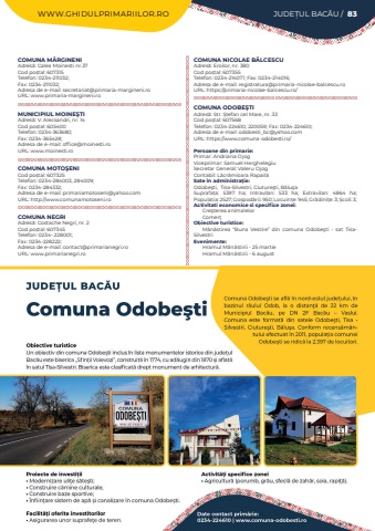 WWW.GHIDULPRIMARIILOR.RO JUDE%u021aUL BAC%u0102U / 83COMUNA M%u0102RGINENIAdres%u0103: Calea Moinesti nr.37Cod po%u0219tal: 607315Telefon: 0234-211032; Fax: 0234-211032; Adresa de e-mail: secretariat@primaria-margineni.roURL: www.primaria-margineni.roMUNICIPIUL MOINE%u015eTIAdres%u0103: V. Alecsandri, nr. 14Cod po%u0219tal: 605400Telefon: 0234-363680; Fax: 0234-365428; Adresa de e-mail: office@moinesti.roURL: www.moinesti.roCOMUNA MOTO%u015eENICod po%u0219tal: 607325Telefon: 0234-284003, 284009; Fax: 0234-284332; Adresa de e-mail: primariamotoseni@yahoo.comURL: http://www.comunamotoseni.roCOMUNA NEGRIAdres%u0103: Costache Negri, nr. 2Cod po%u0219tal: 607345Telefon: 0234- 228001; Fax: 0234-228222; Adresa de e-mail: contact@primarianegri.roURL: www.primarianegri.roCOMUNA NICOLAE B%u0102LCESCUAdres%u0103: Eroilor, nr. 380Cod po%u0219tal: 607355Telefon: 0234-214071; Fax: 0234-214016; Adresa de e-mail: registratura@primaria-nicolae-balcescu.roURL: https://primaria-nicolae-balcescu.ro/COMUNA ODOBE%u015eTIAdres%u0103: Str. %u0218tefan cel Mare, nr. 33Cod po%u0219tal: 607568Telefon: 0234-224610, 220059; Fax: 0234-224610; Adresa de e-mail: odobesti_bc@yahoo.comURL: https://www.comuna-odobesti.ro/Persoane din primarie:Primar: Andriana OjogViceprimar: Samuel HerghelegiuSecretar General: Valeru OjogContabil: L%u0103cr%u0103mioara Rapail%u0103Sate %u00een administra%u021bie:Odobe%u015fti, %u00a0Tisa-Silvestri,%u00a0Ciuture%u015fti,%u00a0B%u0103lu%u015faSuprafa%u021ba:%u00a0 5397 ha; Intravilan:%u00a0 533 ha; Extravilan:%u00a0 4864 ha; Popula%u021bia:%u00a02527; Gospod%u0103rii:%u00a0950; Locuin%u021be:%u00a0945; Gr%u0103dini%u021be:%u00a03; %u0218coli:%u00a03; Activitati economice si specifice zonei:Cre%u015fterea animalelorComer%u0163Obiective turistice:M%u0103n%u0103stirea %u201cBuna Vestire%u201d din comuna Odobe%u015fti - sat TisaSilvestriEvenimente:Hramul M%u0103n%u0103stirii - 25 martieHramul M%u0103n%u0103stirii - 6 august