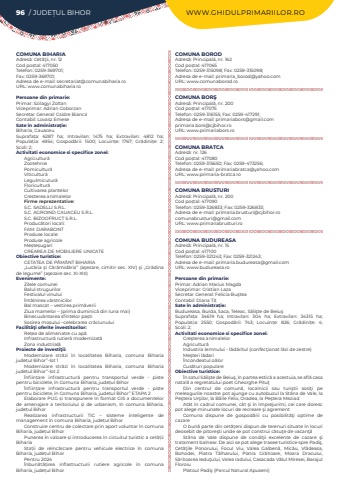 96 / JUDE%u021aUL BIHOR WWW.GHIDULPRIMARIILOR.ROCOMUNA BIHARIAAdres%u0103: Cet%u0103%u0163ii, nr. 12Cod po%u0219tal: 417050Telefon: 0259-369701; Fax: 0259-369701; Adresa de e-mail: secretariat@comunabiharia.roURL: www.comunabiharia.roPersoane din primarie:Primar: Szilagyi ZoltanViceprimar: Adrian%u00a0CoborzanSecretar General: Csidre BiancaContabil: Lovasz EmeseSate %u00een administra%u021bie:Biharia, CauaceuSuprafa%u021ba:%u00a0 6287 ha; Intravilan:%u00a0 1475 ha; Extravilan:%u00a0 4812 ha; Popula%u021bia:%u00a0 4954; Gospod%u0103rii:%u00a0 1500; Locuin%u021be:%u00a0 1767; Gr%u0103dini%u021be:%u00a0 2; %u0218coli:%u00a02; Activitati economice si specifice zonei:Agricultur%u0103ZootehniePomicultur%u0103Viticultur%u0103 Legulmicutur%u0103 Floricultur%u0103 Cultivarea plantelorCre%u0219terea animalelorFirme reprezentative:S.C. SADELLI S.R.L.S.C. AGROIND CAUACEU S.R.L.S.C. BIZOOFRUCT S.R.L.Produc%u0103tori locali:FAM. DARABONTProduse locale:Produse agricoleMe%u0219te%u0219ugari: CREAREA DE MOBILIERE UNICATE%u00a0Obiective turistice:CETATEA DE P%u0102M%u00c2NT BIHARIA%u201eLut%u0103ria %u015fi C%u0103r%u0103mid%u0103ria%u201d (a%u015fezare, cimitir sec. XIV) %u015fi %u201eGr%u0103dina de legume%u201d (a%u015fezare sec. XI-XIII)Evenimente:Zilele comuneiBalul strugurilorFestivalul vinului%u00cent%u00e2lnirea v%u00e2rstnicilorBal mascat %u2013 vestirea prim%u0103veriiZiua mamelor %u2013 (prima duminic%u0103 din luna mai)Binecuv%u00e2ntarea sfintelor pa%u0219tiSosirea mo%u0219ului %u2013celebrarea cr%u0103ciunuluiFacilit%u00e3%u0163i oferite investitorilor:Re%u021bea de alimenatre cu ap%u0103Infrastructur%u0103%u00a0rutier%u0103%u00a0modernizat%u0103 Zona industrial%u0103Proiecte de investi%u0163ii:Modernizare str%u0103zi %u00een localitatea%u00a0 Biharia, comuna Biharia jude%u021bul Bihor%u201d-lot 1Modernizare str%u0103zi %u00een localitatea%u00a0 Biharia, comuna Biharia jude%u021bul Bihor%u201d-lot 2%u00cenfiin%u021bare infrastructur%u0103 pentru transportul verde - piste pentru biciclete, %u00een Comuna Biharia, jude%u021bul Bihor%u00cenfiin%u021bare infrastructur%u0103 pentru transportul verde - piste pentru biciclete, %u00een Comuna Biharia, jude%u021bul Bihor%u201d ETAPA 2Elaborare PUG %u0219i transpunere %u00een format GIS a documentelor de amenajare a teritoriului %u0219i de urbanism, %u00een comuna Biharia, jude%u021bul BihorRealizarea infrastructurii TIC %u2013 sisteme inteligente de management %u00een comuna Biharia, jude%u021bul BihorConstruire centru de colectare prin aport voluntar %u00een comuna Biharia, jude%u021bul BihorPunerea %u00een valoare %u0219i introducerea %u00een circuitul turistic a cet%u0103%u021bii Biharia Sta%u021bii de re%u00eenc%u0103rcare pentru vehicule electrice %u00een comuna Biharia, jude%u021bul BihorPentru 2024%u00cenbun%u0103t%u0103%u021birea inflastructurii rutiere agricole %u00een comuna Biharia, jude%u021bul BihorCOMUNA BORODAdres%u0103: Principal%u0103, nr. 162Cod po%u0219tal: 417065Telefon: 0259-315098; Fax: 0259-315098; Adresa de e-mail: primaria_borod@yahoo.comURL: www.comunaborod.roCOMUNA BOR%u015eAdres%u0103: Principal%u0103, nr. 200Cod po%u0219tal: 417075Telefon: 0259-316155; Fax: 0259-417291; Adresa de e-mail: primariabors@gmail.com primaria.bors@cjbihor.roURL: www.primariabors.roCOMUNA BRATCAAdres%u0103: nr. 126Cod po%u0219tal: 417080Telefon: 0259-315650; Fax: 0259-473256; Adresa de e-mail: primariabratca@yahoo.comURL: www.primaria-bratca.roCOMUNA BRUSTURIAdres%u0103: Principal%u0103, nr. 200Cod po%u0219tal: 417090Telefon: 0259-326833; Fax: 0259-326833; Adresa de e-mail: primaria.brusturi@cjbihor.rocomunabrusturi@gmail.comURL: www.primariabrusturi.roCOMUNA BUDUREASAAdres%u0103: Principal%u0103, nr. 15Cod po%u0219tal: 417100Telefon: 0259-321243; Fax: 0259-321243; Adresa de e-mail: primaria.budureasa@gmail.comURL: www.budureasa.roPersoane din primarie:Primar:%u00a0Adrian Marius%u00a0Magda%u00a0Viceprimar: Cristian LazaSecretar General: Felicia%u00a0Bu%u015ftea%u00a0Contabil: Diana%u00a0%u021ai%u021b%u00a0Sate %u00een administra%u021bie:Budureasa, Burda, Saca, Teleac, S%u0103li%u015fte de Beiu%u015fSuprafa%u021ba:%u00a0 34619 ha; Intravilan:%u00a0 304 ha; Extravilan:%u00a0 34315 ha; Popula%u021bia:%u00a0 2550; Gospod%u0103rii:%u00a0 743; Locuin%u021be:%u00a0 826; Gr%u0103dini%u021be:%u00a0 4; %u0218coli:%u00a02; Activitati economice si specifice zonei:Cre%u015fterea animalelorAgricultur%u0103Industria lemnului - l%u0103d%u0103ritul (confec%u0163ionat l%u0103zi de zestre)Me%u015fteri l%u0103dari%u00cencondeatul o%u0103lorCus%u0103turi populareObiective turistice:%u00cen satul S%u0103li%u015fte de Beiu%u015f, %u00een partea estic%u0103 a acestuia, se afl%u0103 casa natal%u0103 a regretatului poet Gheorghe Pitu%u0163Din centrul de comun%u0103, localnicii sau turi%u015ftii sosi%u0163i pe meleagurile noastre pot ajunge cu autobuzul la St%u00e2na de Vale, la Pe%u015ftera Ur%u015filor, la B%u0103ile Felix, Oradea, la Pe%u015ftera MeziadAt%u00e2t %u00een cadrul comunei, c%u00e2t %u015fi %u00een %u00eemprejurimi, cei care doresc pot alege minunate locuri de recreare %u015fi agrementComuna dispune de gospod%u0103rii cu posibilit%u0103%u0163i optime de cazareO bun%u0103 parte din cet%u0103%u0163eni dispun de terenuri situate %u00een locuri deosebit de pitore%u015fti unde se pot construi c%u0103su%u0163e de vacan%u0163%u0103%u00a0St%u00e2na de Vale dispune de condi%u0163ii excelente de cazare %u015fi tratament balnear. De aici se pot alege trasee turistice spre Padi%u015f, Cet%u0103%u0163ile Ponorului, Focul Viu, Valea Galben%u0103, Mic%u0103u, Vl%u0103deasa, Bohodei, Piatra T%u00e2lharului, Piatra Gr%u0103itoare, Moara Dracului, S%u0103ritoarea Iedu%u0163ului, Valea Iadului, Casacada V%u0103lul Miresei, Barajul FloroiuPlatoul Padi%u015f (Parcul Natural Apuseni)